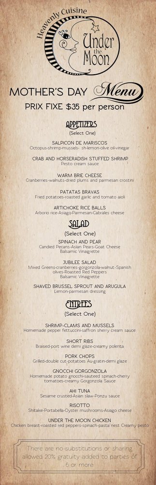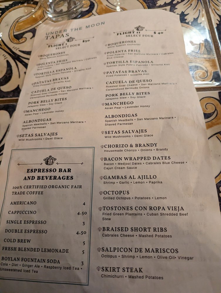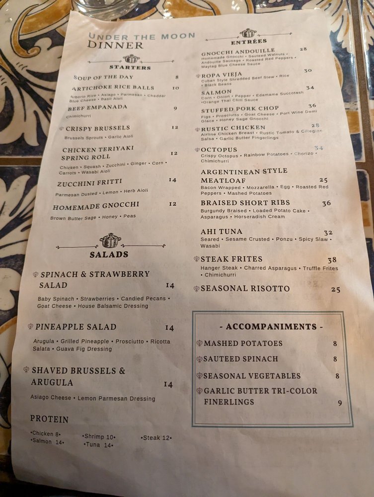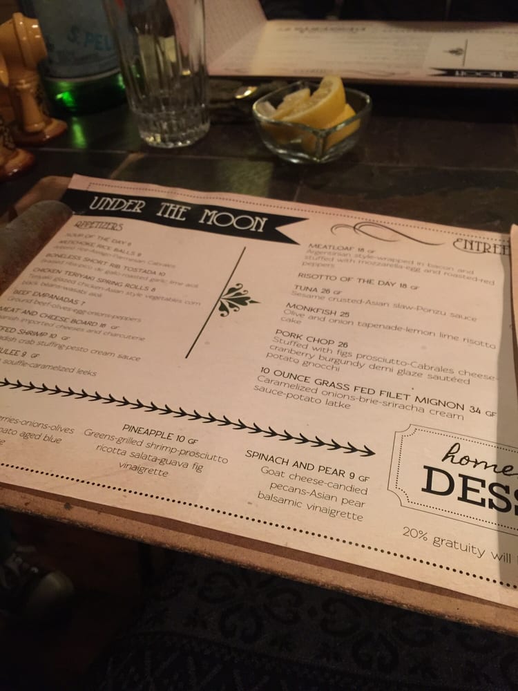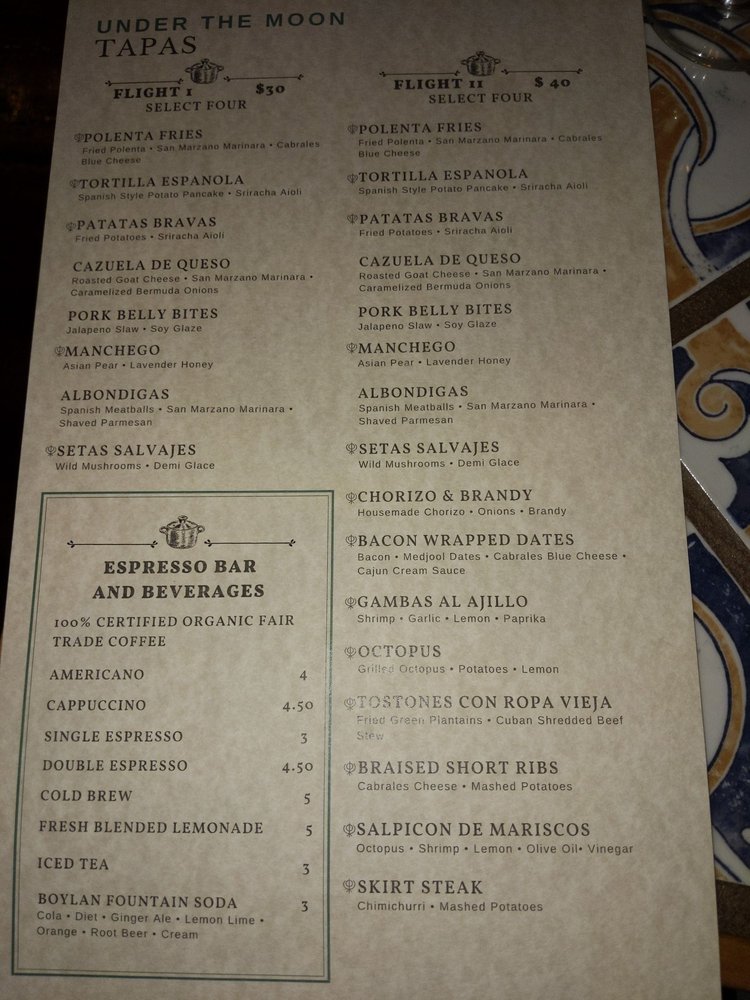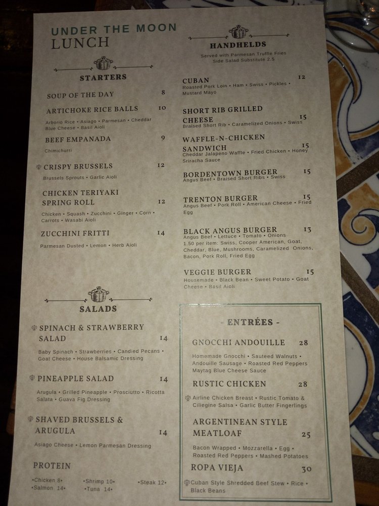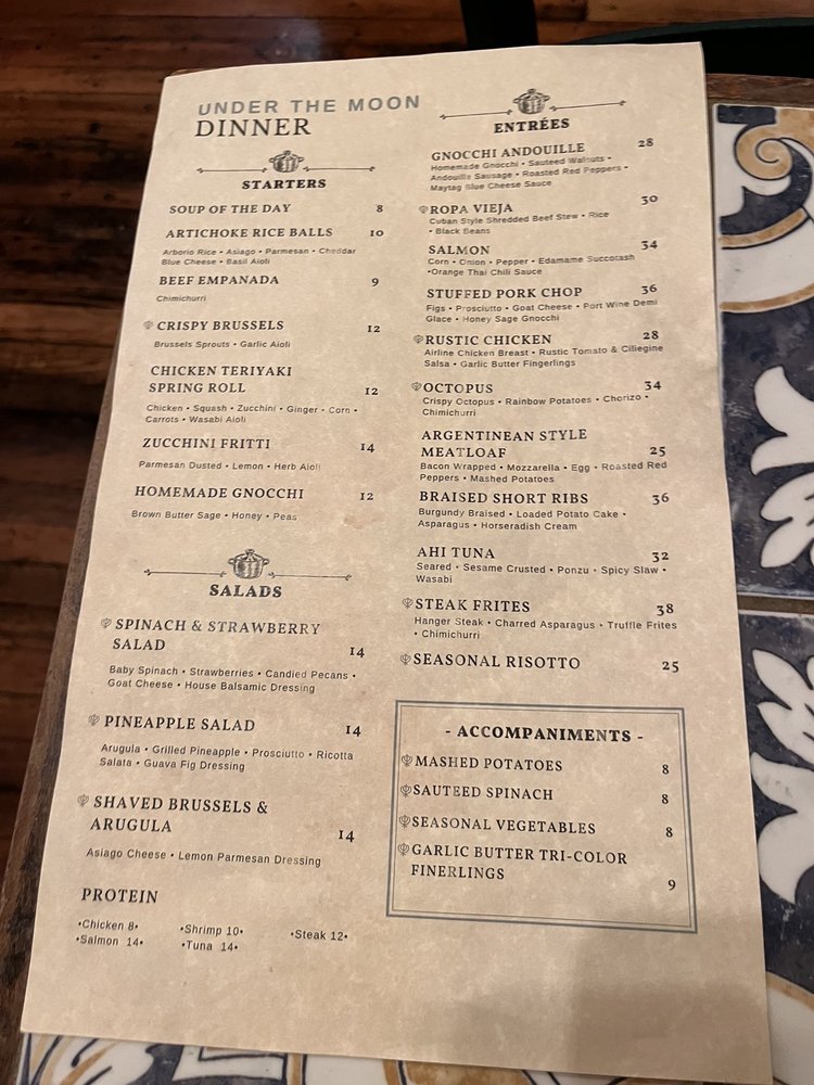 Introducing the menu at Under the Moon Cafe, a Basque-Asian fusion gem located in Bordentown, NJ. With a menu full of diverse options, from artichoke rice balls to Ahi Tuna, this cafe offers an eclectic dining experience. Customer favorites like the meatloaf and smoked salmon salad are raved about for their exceptional flavors. The ambiance is warm and inviting, perfect for a relaxed meal. The attentive staff ensure a positive dining experience, although the lack of alcoholic beverages may be a drawback for some. Customers praise the tapas for their perfect mix of flavors and creativity. Overall, Under the Moon Cafe is a clear winner in the Bordentown dining scene, offering delicious and innovative dishes in a cozy and welcoming setting.